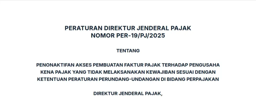 PER-19/PJ/2025 menetapkan kriteria dan proses penonaktifan akses pembuatan faktur pajak untuk PKP yang tidak patuh; baca ringkasan, dampak, dan langkah preventif. PER-19/PJ/2025 adalah Peraturan Direktur Jenderal […]